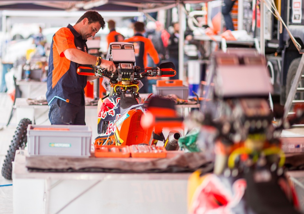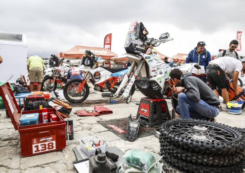 Con questo avete capito anche che per i primi che sono arrivati il pomeriggio precedente, tipo i Motociclisti delle Squadre ufficiali che trovano il campo montato e i meccanici pronti e riposati (si sono risparmiati la trasferta al bivacco della Marathon) è una giornata di un certo tipo. Effettivamente di riposo. Per quelli che si sono infilati nella notte, magari con un UTV, gelati, magari con qualche problema, e che sono arrivati all’alba o durante il giorno, è tutta un’altra cosa. Addio riposo. L’atmosfera è buona, molto più che in altre occasioni. Ci sono dei momenti di pace, i diversivi, lavarsi i panni, farsi la barba o mangiare qualcosa di buono. Il numero 1 è il barbecue, il numero 1 dei numeri 1 il barbecue di Motul Original. Motul Original. L’origine della specie. È quell’area che raccoglie i Motociclisti delle vecchie “malles”, le casse di ricambi e effetti personali trasportate dall’organizzazione per quei Concorrenti che non possono permettersi un’assistenza. Oggi c’è anche un camion con attrezzi, saldatrici e compressori, illuminazione e lubrificanti, Motul appunto. Resta lo spirito originale. Ognuno fa da sé, interviene da solo sulla propria Moto, si fa aiutare da un compagno di Avventura o si presta a dare una mano.