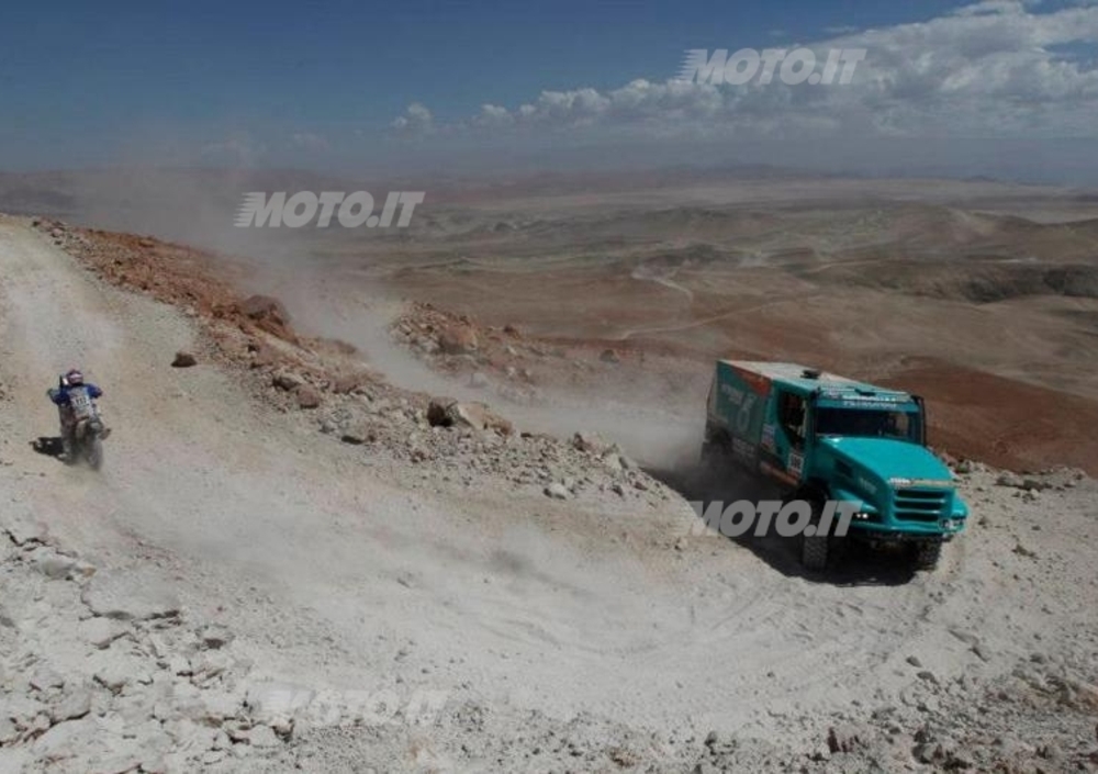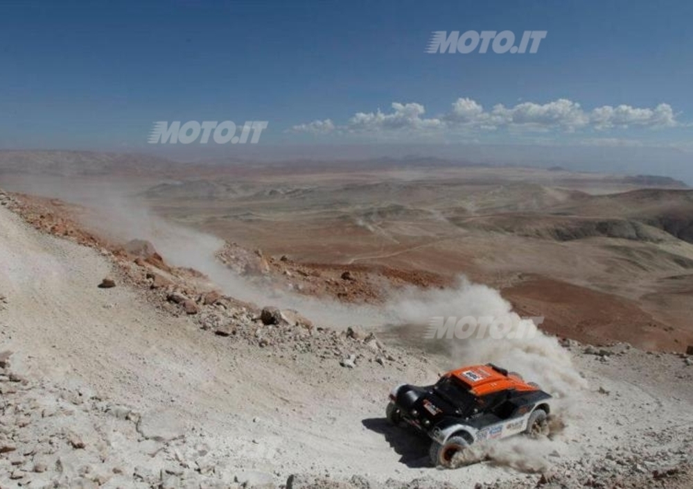 I Buggy perdono progressivamente terreno, Al-Attiya commette anche un piccolo errore di navigazione, ma si mantengono a ridosso del plotone al comando, di cui fanno parte tre Mini e una Toyota. All’arrivo di Tacna le posizioni sono immutate: primo Roma e secondo Peterhansel. Con un ultimo ruggito Robby Gordon scavalca De Villiers e inserisce il suo Hummer al terzo posto. D’ora in avanti sarà presumibilmente questa la strategia dell’americano: nessuna… strategia, pedale dell’acceleratore a fondo, per il delirio degli spettatori. I Buggy di Sainz (quinto) e Al-Attiya “tengono”, ma quest’ultimo cede in pista altri sei minuti, tutti a favore del leader, Stephane Peterhansel, che da l’impressione di apprestarsi al decollo.