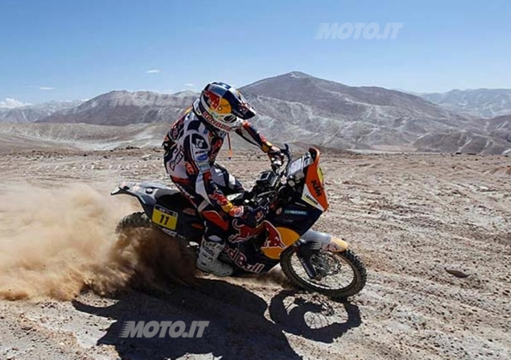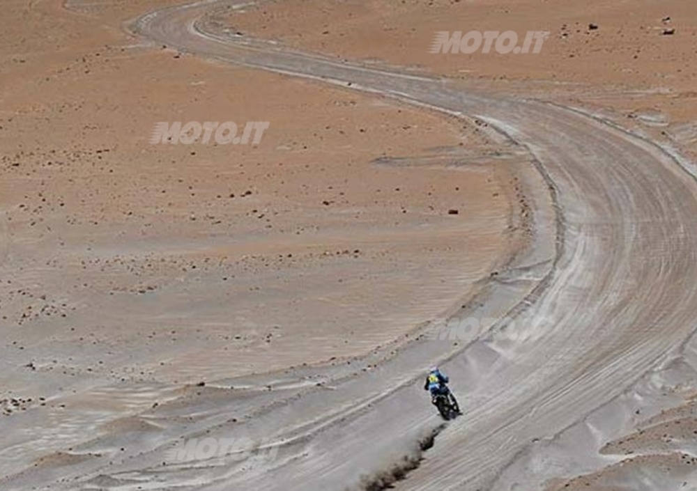 Tappa da affrontare con circospezione, magari mandando in scena un po’ di fifa. Troppi chilometri e un ventaglio di trappole che riunisce tutto il “best of” delle cinque tappe peruviane. Giusto che gli interessati alla classifica si tengano fuori dai guai, eloquentemente rappresentati dalla navigazione, dalla sabbia molle, e dal fesh-fesh. I primi a partire rallentano subito l’andatura e consentono ai loro inseguitori di ottenere i migliori parziali cronometrici. Per Olivier Pain e David Casteu il compito di aprire la pista e contemporaneamente proteggere la propria classifica è, oggi, un autentico supplizio. Si mettono in luce il cileno Israel Esquerre e soprattutto l’americano Kurt Caselli. Javier Pizzolito ancora una volta è il più attivo dei Piloti Honda.
