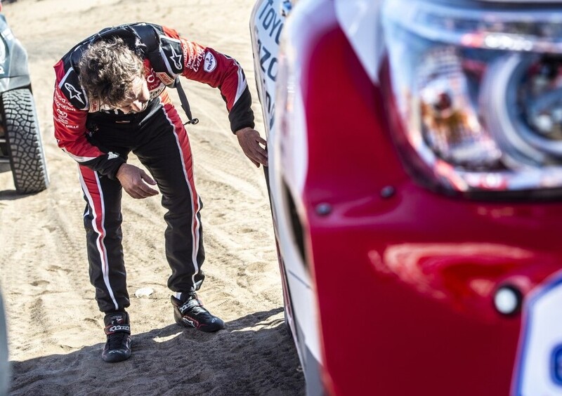 Attorno a metà della Speciale, al chilometro 160, si fermano Alonso e Coma. La loro Hilux, che viaggiava attorno alla terza-quarta posizione, ha urtato un masso e ha una sospensione rotta. Fermi sulla pista a riparare, in attesa del camion di assistenza in gara, che deve seguire obbligatoriamente la stessa pista. Due ore e mazza per riflettere su un fatto prettamente “dakariano”: la lunga lotta per rimanere in gara.