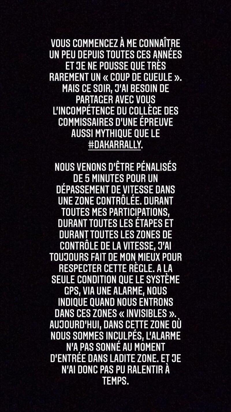 Sebastien Loeb. “In tutti questi anni avete imparato a conoscermi un po’, e raramente mi lascio a uno sfogo. Ma stasera ho bisogno di condividere con voi l'incompetenza del Collegio dei Commissari di un evento mitico come la Dakar. Siamo appena stati penalizzati di cinque minuti per il superamento della velocità in una zona controllata. Durante tutte le mie partecipazioni, durante tutte le tappe e durante tutte le zone di controllo della velocità, ho sempre fatto del mio meglio per rispettare questa regola. Alla sola condizione che il sistema GPS, tramite un allarme, ci comunichi quando entriamo in queste zone “invisibili”. Oggi, nella zona di cui stiamo parlando, l'allarme non ha suonato nel momento in cui siamo entrati nell’area. Quindi non ho potuto rallentare in tempo.