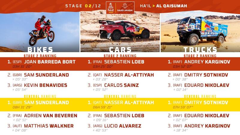 Lasciateci dunque godere del duello che sta andando in scena, che profuma di benzina e che rischia di far saltare il banco delle scommesse giorno dopo giorno. Più che un duello è uno scontro tra Titani, Nasser Al Attiyah contro Sébastien Loeb, ingigantito dal fatto che il Goliath dell’industria automobilistica se la deve vedere contro un Davide inglese di nome Prodrive, o BRX se si vuole leggere sulla carrozzeria rossa delle Hunter. I due stanno sparecchiando la tavola degli avventori spartendosi i bottini di giornata, separati da dieci minuti scarsi e già lontani davanti a tutti, tre quarti d’ora almeno.