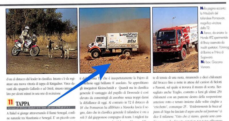 Pronti… ah, un’ultima cosa. Voglio darvi un’idea dell’atmosfera in cui nasce il Progetto. Non è una miscela di molecole casuali ma di esperienze e passioni di lunga data. Serena è la moglie di Alberto, si diceva, e “casualmente” è la nuora di Giovanni Bonino. Giovanni ha un’esperienza diretta e una passione infinita e intramontabile. Per esempio, ha fatto la Dakar del 1996 come assistenza di Giacomo Vismara, nell’anno in cui il primo vincitore italiano della Dakar, 1986, concluse all’8° posto assoluto con una SsangYong. Ecco, Vismara nel 1986 aveva vinto con quel Merceders Unimog, lo stesso ai cui comandi, dieci anni dopo, c’era Giovanni. Insomma quel 435 con cui correranno Monica, Rachele e Serena altro non è che lo stesso indistruttibile mezzo anche 30 anni dopo. Bene, abbiamo capito che aria si respira in quel Team!