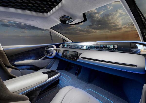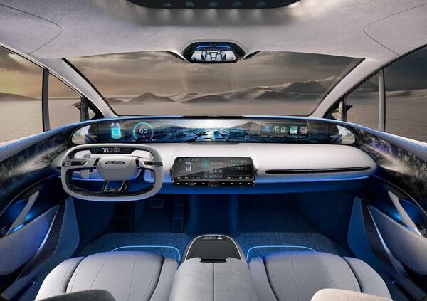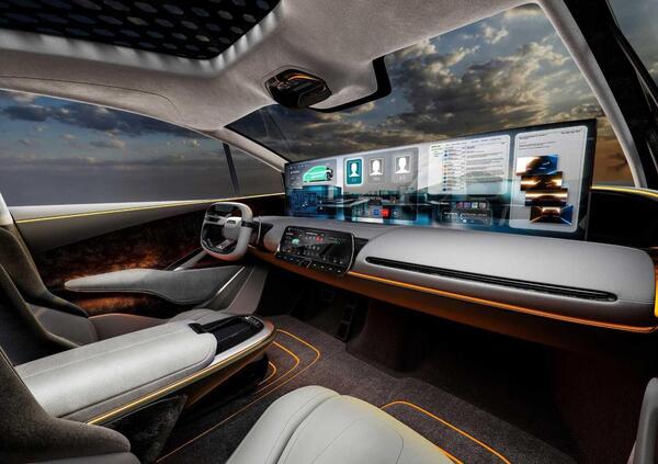 Per quanto riguarda la tecnologia, all’interno possiamo trovare un ampio schermo che ricopre in lunghezza tutta la plancia e quando si sta guidando, si potranno visualizzare tutte le informazioni necessarie come la velocità, l’autonomia e il navigatore. Inoltre, quando il suv è parcheggiato, lo schermo può estendersi verso l’alto, trasformando l’auto in un home theatre o in ufficio (come ad esempio vedere tutti i partecipanti in una videochiamata).