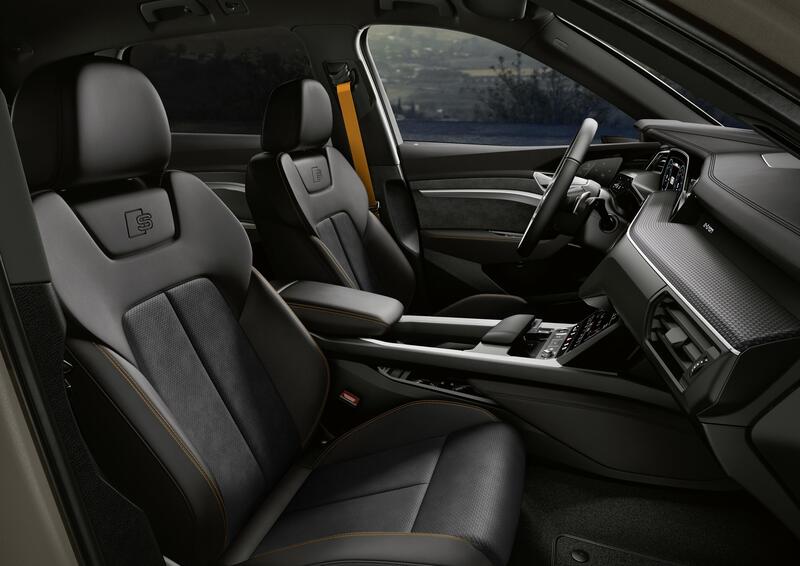 Audi e-tron S Line si presenta più ricca e rifinita in questa Black Edition, impreziosita da dettagli in nero e finiture più raffinate. Il nuovo allestimento, disponibile su entrambe le motorizzazioni così come sulla versione Sportback, si fa notare già alla prima occhiata. La griglia single frame, marchio di fabbrica del brand, è in nero, così come i quattro anelli, le conchiglie dei retrovisori e i badge e-tron posti sulla vettura. Ci sono poi nuovi cerchi in lega da 21 pollici, anch’essi neri, che mettono a risalto le pinze dei freni in arancione. Vetri oscurati al posteriore e finiture metalliche (in grigio Chronos, bianco Glacier e nero Mythos) sono poi disponibili in opzione. Passando agli interni, dove aprendo la portiera viene proiettata la firma luminosa “ e-tron black edition” sull’asfalto, troviamo altri dettagli inediti.