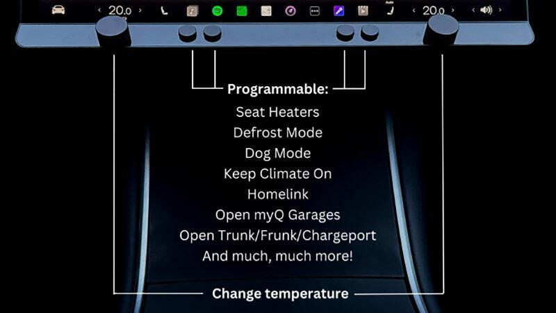 Questa barra fornisce due manopole per controllare la temperatura e quattro pulsanti programmabili. In questo modo, sarà possibile impostare come si vuole la plancia di Tesla.