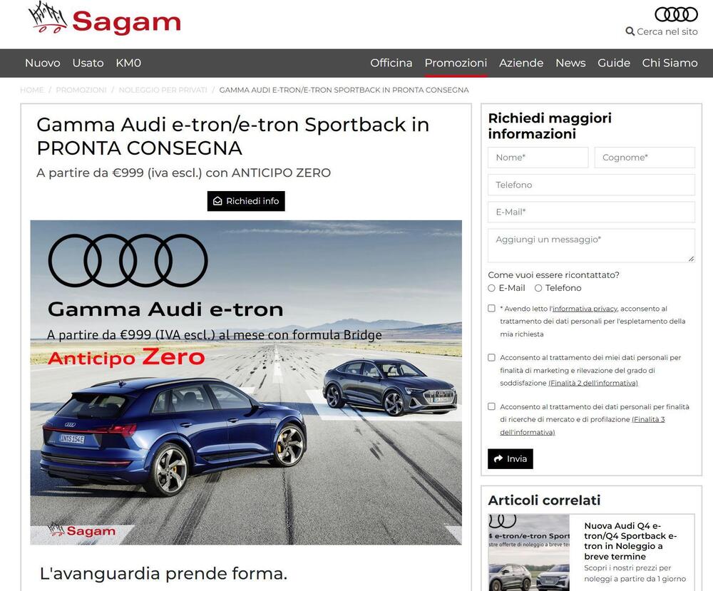 Della nuova gamma elettrica Audi e-tron si è detto e scritto molto, ma per conoscere nel concreto in prima persona le vetture attualmente su listino prezzi Italia, Sagam ha organizzato due appuntamenti con test drive ad accesso gratuito previa registrazione e visita in salone, per un appuntamento con preventivo.