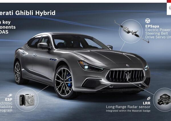 Anche sicurezza e comfort sulla nuova sportiva Maserati ibrida sono gestiti da un'elettronica Bosch. Active driving assist e i classici (per auto premium) ACC, AEB, lane keeping assist e active blind spot assist. Elemento basilare qui è il sensore radar a lungo raggio. Sempre Bosch anche i sistemi di controllo elettronico stabilità e sterzo elettrico. L’active driving assist è il sistema più evoluto, che combina le tecnologie adaptive cruise control e lane centering regolando velocità, accelerazione, frenata e sterzo della Ghibli ibrida. Grazie a due tecnologie, l'ottimizzazione del controllo laterale e longitudinale della marcia permette una guida parzialmente autonoma (livello SAE 2).