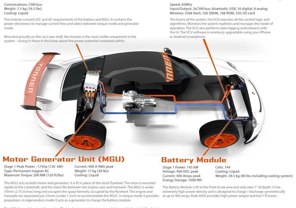 Il kit, del costo di partenza di 75.000 dollari (installazione inclusa), comprende: un motore elettrico da installare al posto del volano della potenza di 175 CV (è in preparazione anche uno step da 350 CV) e 200 Nm; un pacco batterie da 1 kWh raffreddata a liquido; una unità per il controllo software del sistema aggiornabile tramite smartphone Apple o Android e un inverter.