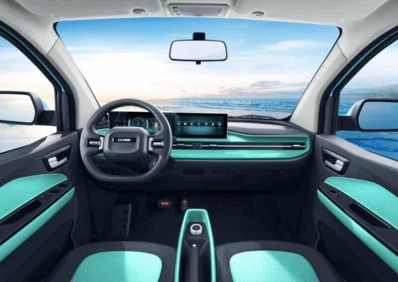 Oltre alle ruote da 13 pollici, l’interno dell’auto ha una combinazione di colori sull’azzurro/turchese e il nero. Il modello top di gamma, viene offerto con un doppio schermo (ognuno di 10,25 pollici) che ricopre sia la parte del cruscotto che la parte centrale per l’infotainment. Invece, per i modelli di fascia bassa, i due schermi hanno una dimensione di 7 pollici.