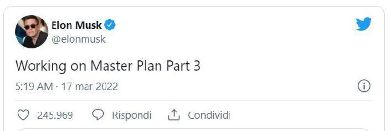 Il vulcanico Elon Musk in questi giorni non ha solo lanciato una sfida, rimasta su social, a Putin, è anche al lavoro per il suo noto Tesla Master Plan. Si tratta di stendere e divulgare al mondo la terza parte, dopo che nelle prime due si era già parlato di molti aspetti, non solo automobilistici, ora l’attesa è grande. Soprattutto da parte dei fan di Elon.