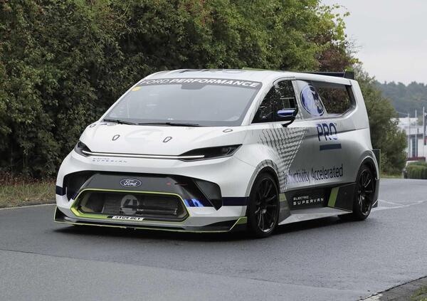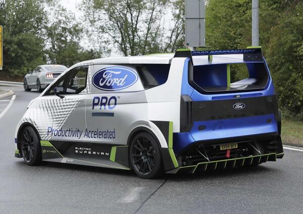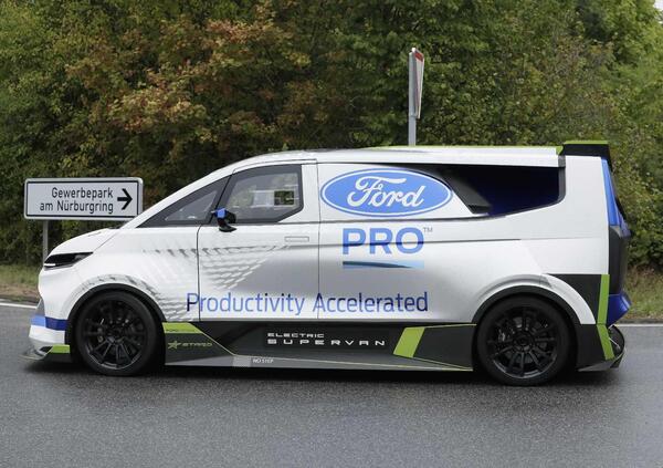 Al Goodwood Festival, Ford aveva presentato un furgone elettrico che assomigliava molto ad un’auto da corsa. Negli ultimi giorni, è stato avvistato al circuito del Nürburgring il Ford Pro Electric SuperVan, dotato di quattro motori elettrici alimentati da una batteria di 50 kWh.