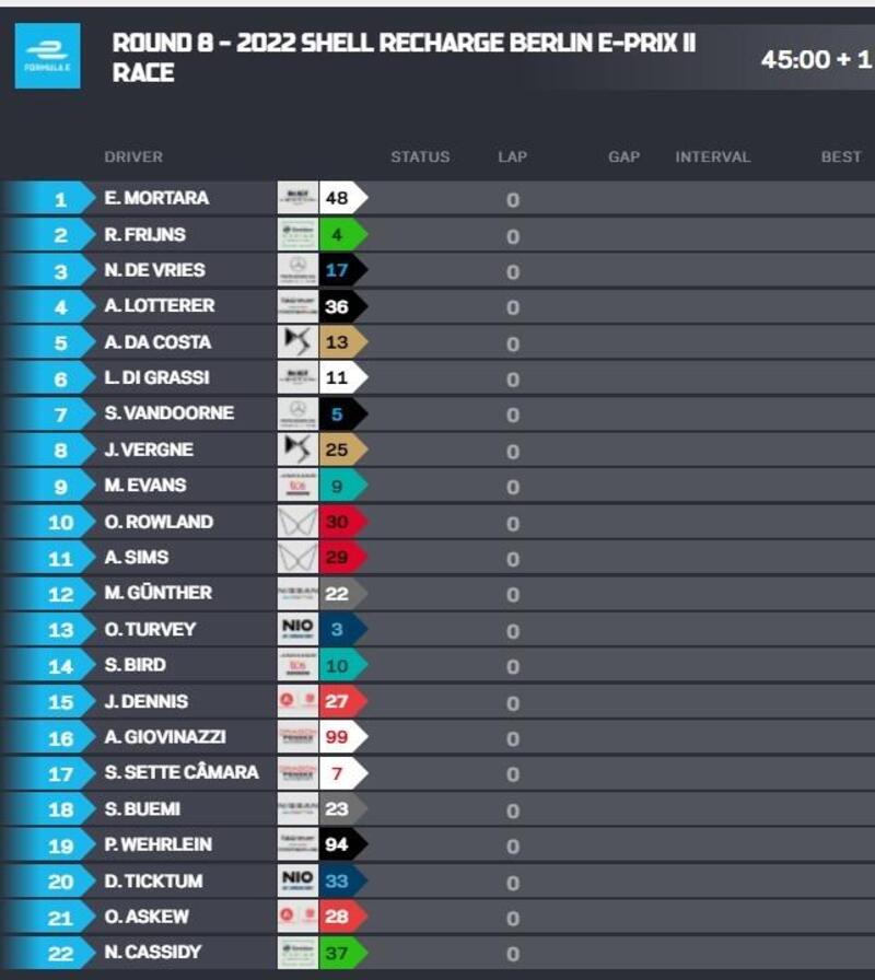Mortara in precedenza ha eliminato in semifinale il rivale del mondiale 2021 Nyck De Vries, che ha cancellato le brutte prestazioni di ieri, e scatterà dalla seconda fila con Andrè Lotterer sconfitto da Frinjs . Si sono fermati ai quarti Antonio Felix Da Costa il migliore in casa Ds che partirà quinto, davanti a Lucas Di Grassi sesto, alle loro spalle Stoffel Vandoorne, come Sabato autore di prove ufficiali difficili, per una Mercedes molto nervosa in inserimento curva, e Jean-Eric Vergne.
