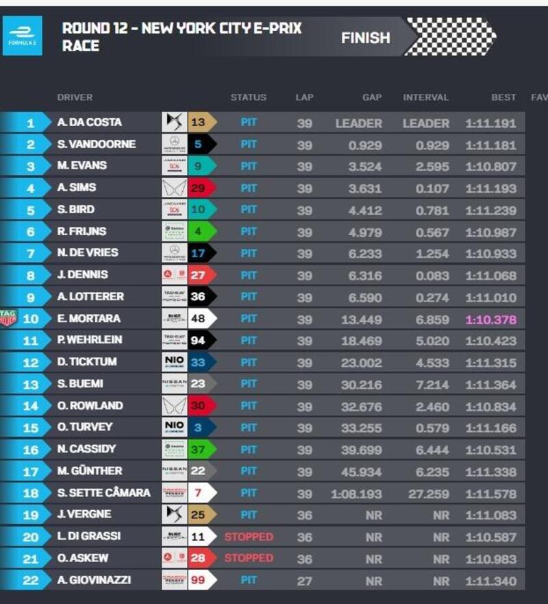 De Vries regala ancora emozioni e nuovamente per superare Sims ad otto minuti dalla bandiera a scacchi, come Evans in precedenza, perde il controllo della vettura, e torna in pista quinto dietro all'inglese, ma poi viene passato anche dall'altra Jaguar di Bird, e Frinjs. Evans tornato quarto si scatena come a metà gara, si prende il terzo posto e si lancia all'inseguimento dei primi due. Vandoorne quando stava iniziando a farsi vedere negli specchietti da Da Costa può solo mettergli pressione nell'ultimo giro, per l'incidente in curva 7 di Di Grassi. Da Costa è perfetto anche nell'ultima tornata e va a cogliere la prima vittoria stagionale, davanti a Vandoorne che si accontenta del secondo posto e di tornare leader del mondiale. Sul gradino più basso del podio Evans, che precede Sims, Bird e Frinjs. L'errore nel finale fa tagliare a De Vries il traguardo settimo, con Dennis, Lotterer e Mortara che completano la zona punti. Fuori dalla top ten Wehrlein undicesimo, seguito da Tickum, Buemi, Rowland e Turvey. Chiudono l'ordine d'arrivo del secondo EPrix di New York, Cassidy che per il drive trought al termine del primo giro per la sostituzione delle batterie non ha potuto rimontare, Gunther, Sette Camara crollato nel finale in fondo alla classifica. Vergne chiude un week end da dimenticare ritirandosi a quattro giri dalla fine.