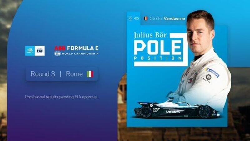 Stoffel Vandoorne conquista la superpole e scatterà davanti a tutti nel primo dei due ePrix in programma a Roma in questo week end. 1.38.484 è il crono fatto segnare da Vandoorne, che si è preso tre punti nella classifica piloti, e fatto ottenere la seconda pole della stagione alla Mercedes. Il belga ha sfruttato l'errore nel terzo settore di Andrè Lotterer, che nel T2 aveva il miglior intermedio ed invece per alcuni errori e aver forato una ruota nelle ultime curve, si deve accontentare per 167 millessimi della seconda posizione.