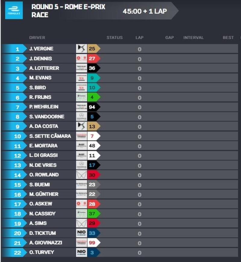 Chiudono la top ten Antonio Felix Da Costa e Nick De Vries che non è riuscito a superare il gruppo di qualificazione insieme a Edoardo Mortara undicesimo. In sesta fila con il leader del mondiale prenderà il via Sette Camara classificatosi davanti al connazionale Lucas Di Grassi, e Oliver Rowland. Seguono Sebastian Buemi, Oliver Askew, Maximilian Guenther e Nick Cassidy. Completano lo schieramento Alexander Sims, Dan Tickum, Antonio Giovinazzi che non è riuscito a migliorare le sue prestazioni rispetto a Sabato ma partirà nuovamente in ultima fila con Oliver Turvey.