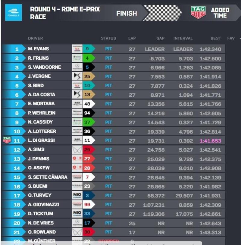 A cinque secondi e sette da Evans taglia il traguardo Robert Frinjs che nell'extratime ha superato Stoffel Vandoorne il quale si deve accontentare del gradino più basso del podio. Alle loro spalle Jean-Eric-Vergne che era salito momentaneamente in terza posizione per poi ricevere la risposta di Frinjs, Sam Bird e Antonio Felix Da Costa.