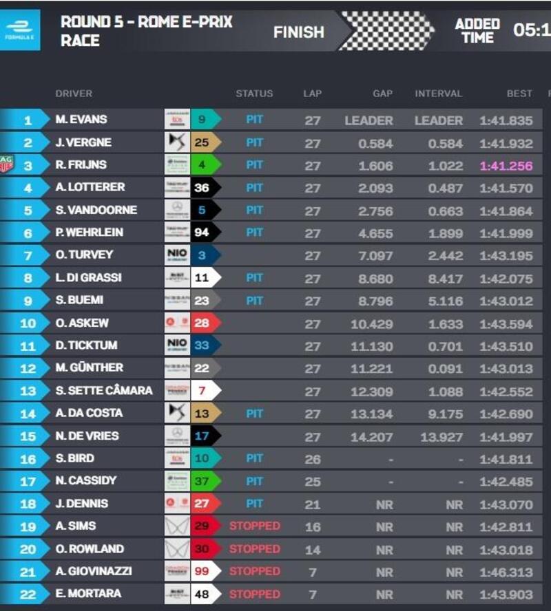 Doppietta di Mitch Evans nella seconda gara di Roma. Il pilota della Jaguar si è imposto nella quinta prova del mondiale 2022 di Formula E. Questa è la quarta vittoria della carriera nella categoria elettrica per Evans, la terza nella Capitale. Il neozalandese ha bissato il successo di Sabato sfruttando l'attack mode ad otto minuti dal termine che gli ha consentito di andare in testa, per poi difendere la prima posizione nel finale quando la safety car è tornata ai box.