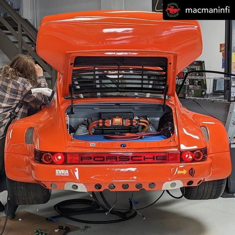Visto a Vegas ‘21, quello di cui si riprendono qui immagini e video è un kit trasformazione Porsche 911 in elettrica, motorizzata Tesla. In sostanza una Porsche 964 esposta al SEMA con “restomod” by Electric GT che perde il sei cilindri, per fare una moderna opera retrofit Tesla (motore, caricatore e inverter).