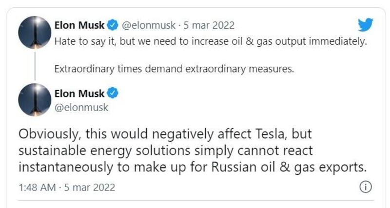Anche Elon Musk cambia opinione sulle soluzioni energetiche da sfruttare, di fronte alla crisi bellica che tocca l’Ucraina ma incide sul mondo delle materie prime e delle risorse per tutti. Uno come lui, capace di innescare parte delle rivoluzione nell’auto, pensionando i motori alimentati a carburante classico, oggi deve dire pur odiando il concetto, che: “dobbiamo aumentare immediatamente la produzione petrolio e gas:. tempi straordinari richiedono misure straordinarie”.