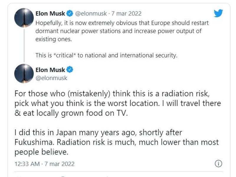 La sua non è solo teoria, quando ricorda, sempre twittando apertamente, che il nucleare è a suo giudizio molto meglio per il riscaldamento globale, rispetto alla combustione di idrocarburi. Anche sul tema dei rischi radiazioni, Musk non si risparmia a favore del nucleare, dicendo che potrà andare in zone limitrofe alle centrali e mangiare quanto viene coltivato in loco.