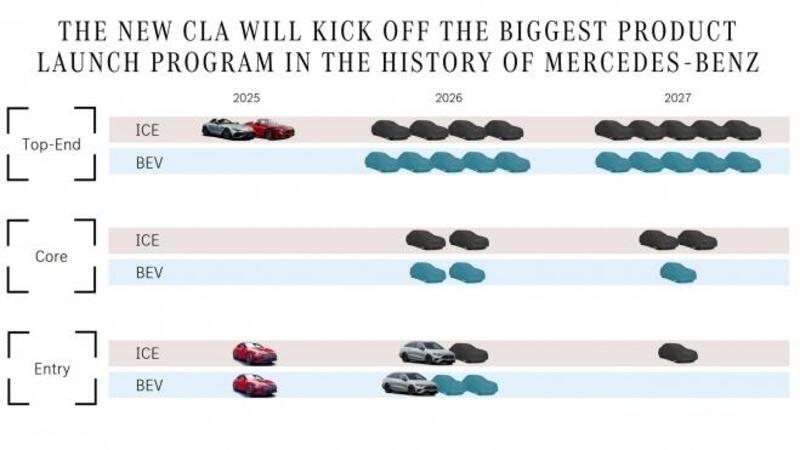 L’annuncio è arrivato tramite una presentazione agli investitori, accompagnata da un'immagine teaser che anticipa la mole di novità in arrivo. Se molti modelli restano ancora avvolti nel mistero, alcuni sono invece già confermati. Tra questi spiccano la nuova Mercedes GLC elettrico, attesa al Salone di Monaco nelle prossime settimane, e la versione a batteria del Mercedes GLB, che seguirà a breve distanza.