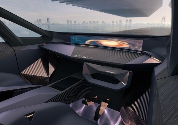 Infine, dentro l’abitacolo, Nissan ha lavorato per offrire uno spazio a bordo come se fosse un salotto di casa e, come gli altri concept, i sedili dei passeggeri anteriori possono ruotare completamente sul proprio asse.