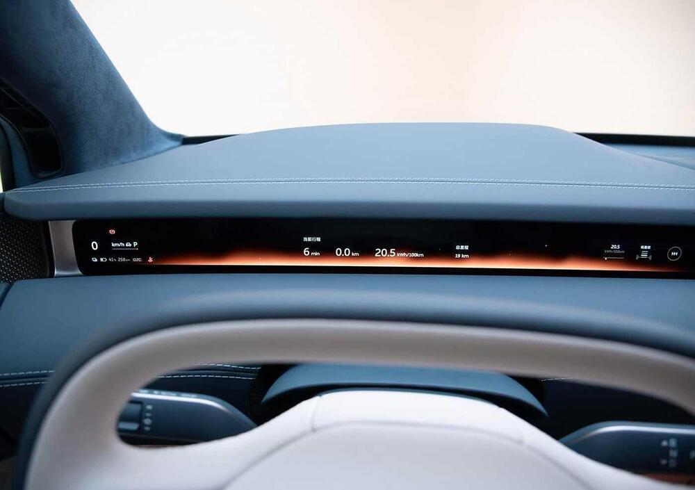 L’abitacolo è rivestito in pregiata pelle Nappa con 2 milioni di punti di cucitura, e integra tecnologie all’avanguardia come il sistema operativo SkyOS, progettato esclusivamente per veicoli. Il cruscotto è dominato da due schermi LCD di grandi dimensioni, tra cui un display widescreen che si estende lungo tutta la plancia e un secondo schermo per l’infotainment, posizionato sopra il tunnel centrale.