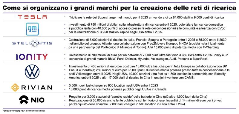 Nella grafica qui sopra, ecco come si stanno organizzando i grandi gruppi automobilistici, convinti oramai dai fatti che una volta create le reti, i clienti arriveranno, qualcuno più volentieri, altri un po' meno ma di fatto "costretti" dalle circostanze: divieti locali, incentivi, prezzi in salita per alcuni tipi di motori termici. Com'è evidente, molti capitali sono destinati al territorio cinese, che sta spingendo molto forte sull'elettrificazione, ma anche nel Vecchio Continente i progetti sembrano promettenti. Molti però si stanno arenando nelle paludi burocratiche dei singoli Paesi. In questo scenario c'è un "grande assente", il primo costruttore al mondo, cioè Toyota, non ha resi pubblici i propri programmi, pur avendo presentato un vasto progetto di elettrificazione basato su moltissimi nuovi modelli.