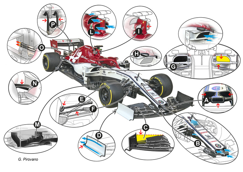 L'attesa Alfa Romeo C38 presenta diverse soluzioni tecniche e aerodinamiche originali: vediamole nel dettaglio. Le novità cominciano dal muso (A): largo con bulbo centrale molto sporgente, adotta tre voluminosi buchi per incanalare aria. Quello centrale è simile a quello Red Bull mentre altre due aperture sono più arretrate e ai lati.