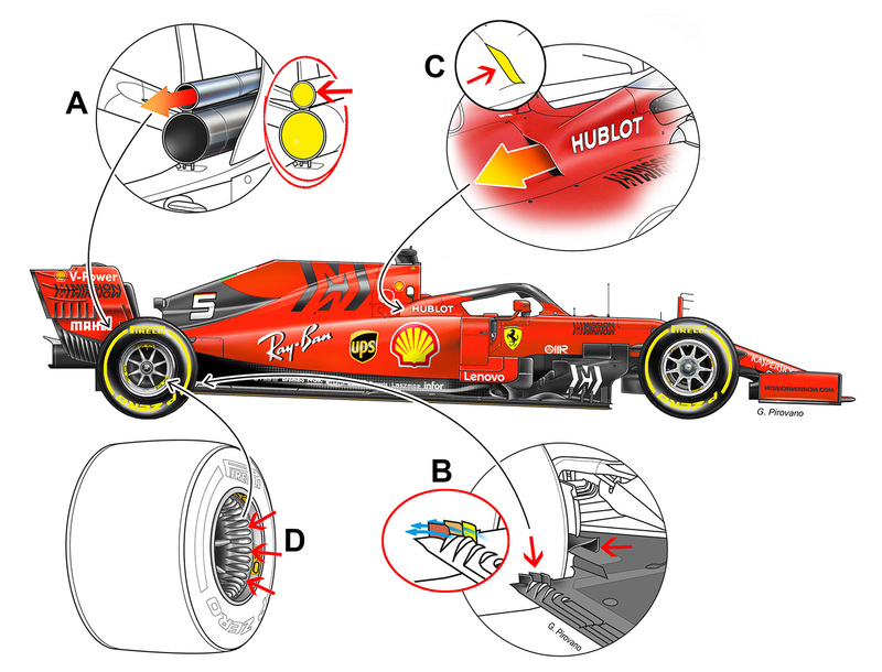 Ai lati dell'abitacolo, più precisamente dietro l'Halo, è stata invece aperta una feritoia (C) per smaltire calore. Nella prima tranche di test, poi, la Ferrari, ha provato dei cerchi posteriori (D) simili a quelli della Mercedes, per smaltire più calore dai cestelli dei freni e dagli pneumatici. Questa soluzione è stata poi abbandonata.