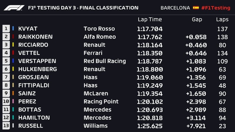 Miglior tempo per Daniil Kvyat nella terza giornata di test pre-stagione di Formula 1 a Barcellona: il russo ha portato la Toro Rosso in cima alla classifica grazie al crono di 1'17"704, ottenuto con il compound più tenero portato da Pirelli a Montmelò per le prove, C5. Kvyat, autore di 137 giri, ha preceduto Kimi Raikkonen, dell'Alfa Romeo. Raikkonen si è distinto in termini di giri percorsi, 138. Altrettanto diligente è stato il suo ex compagno di squadra, Sebastian Vettel: il tedesco, autore di 134 tornate, ha concluso la giornata in quarta posizione con un tempo colto con la mescola C3, l'intermedia.