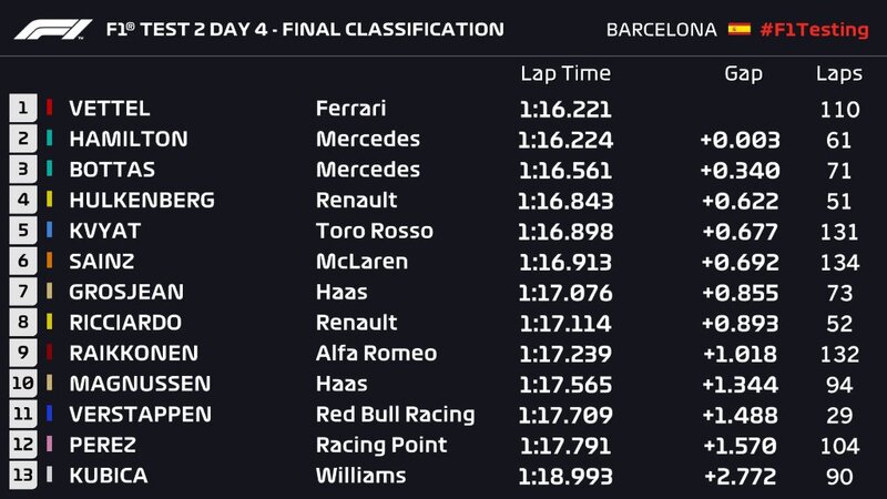 L'ultima giornata di test pre-stagione di Formula 1 a Barcellona si è conclusa con il miglior tempo di Sebastian Vettel: 1'16"221 è il crono colto dal pilota della Ferrari con le C5; si tratta di un giro di meno di un decimo più lento rispetto alla pole position fatta registrare da Lewis Hamilton al Circuit de Catalunya lo scorso anno. Vettel ha preceduto a parità di mescola l'inglese della Mercedes, Lewis Hamilton. Segue il compagno di squadra di quest'ultimo, Valtteri Bottas.