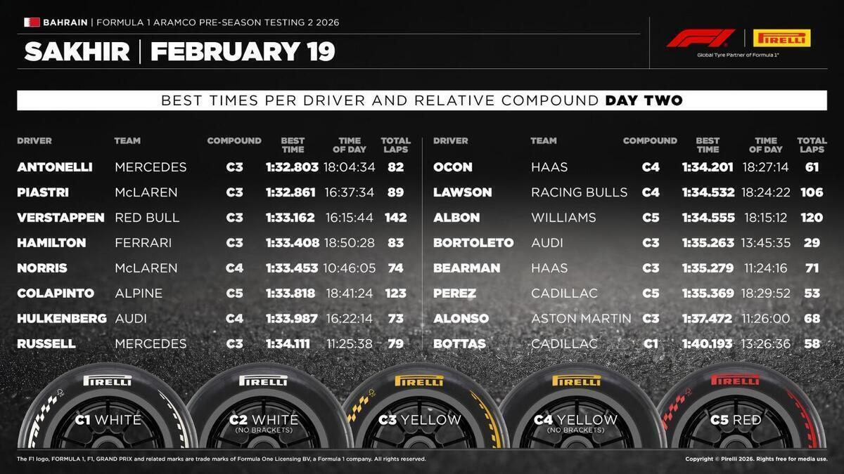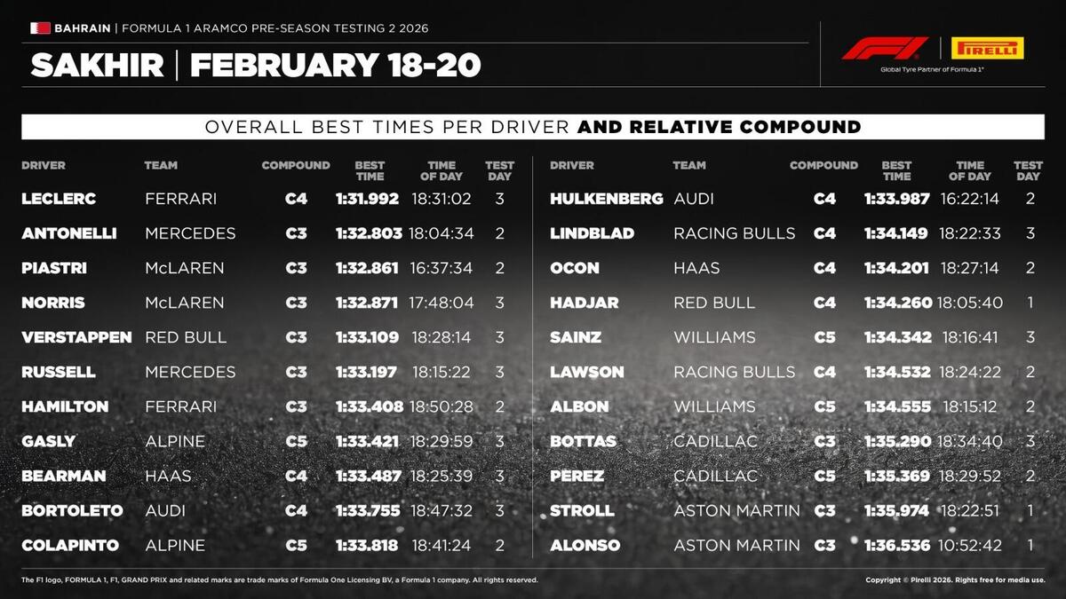 tempo e 59 giri all’attivo. Seguono Lindblad, Sainz, Hulkenberg e Perez.