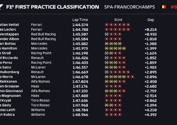 Si è concluso il venerdì del GP del Belgio 2019 (qui gli orari TV): nonostante il problema tecnico di Stroll, questa mattina Vettel ha stampato un gran giro secco, 1'44"572, seguito dal compagno di squadra di soli 2 decimi. Pensate che, Verstappen (3° nelle FP1) è stato staccato di quasi un secondo. Nel pomeriggio, le Ferrari si sono dimostrate ancora velocissime sul singolo giro, infatti Leclerc ha migliorato ancora, abbassando il miglior tempo in 1'44"123. I problemi per le rosse sono arrivati nel corso della simulazione gara, dove i tempi sono sono notevolmente alzati e le Mercedes e le Red Bull si sono fatte vedere.
