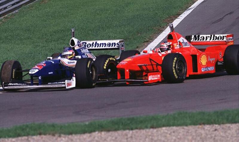 Tre anni, e un titolo mondiale in più con la Benetton dopo, Schumacher, passato alla Ferrari, si ritrovò nella stessa situazione del 1994. Michael arrivò a Jerez per l'ultima gara stagionale con un punto di vantaggio su Jacques Villeneuve, forte della sua Williams FW19 delle meraviglie. La scena alla Dry Sac è rimasta nella storia: Jacques tentò il sorpasso, Michael si difese chiudendolo con foga e gettando nella sabbia la sua monoposto e le sue speranze mondiali. Villeneuve riuscì a portare al traguardo la sua FW19 malconcia, dando strada, per evitare problemi, a David Coulthard e Mika Hakkinen, che quel giorno colse la sua prima vittoria, promessa di successi futuri.