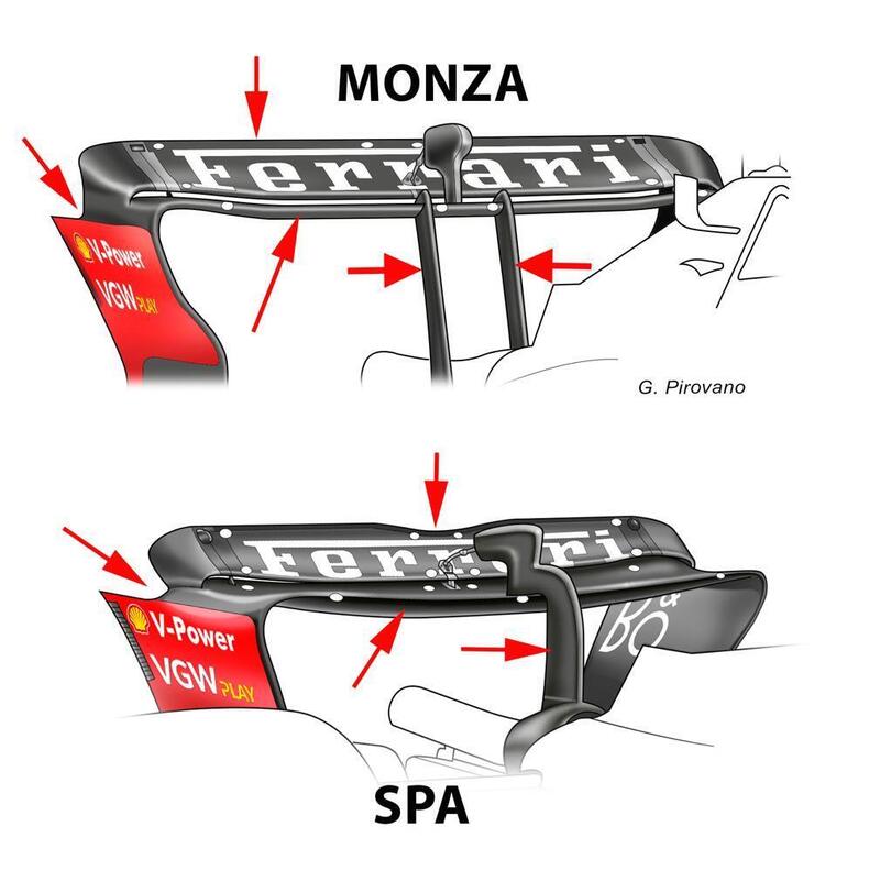 Dall'illustrazione di Pirovano possiamo mettere a confronto le versioni dell'ala portata da Ferrari qui a Monza con quella portata a Spa, tracciato dalle caratteristiche simili alla pista italiana e su cui Leclerc ha conquistato un podio. Non vi è familiare? Se la risposta è sì, è perchè, in effetti, questo design non è completamente innovativo ma si ispira alla versione dello scorso anno, usata sempre a Monza, per il GP d'Italia di F1 2022.