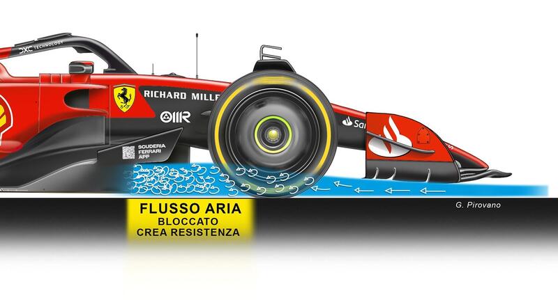 Ovvero c’è un picco di depressione che concentra in quel punto l’aria, creando in pratica un “blocco” che impedisce al flusso il normale proseguimento verso il fondo. Siccome non avviene sempre, ma solo in certe circostanze (e magari sparisce in ingresso curva) ecco spiegato anche visivamente le lamentele di Leclerc alle prese con una macchina incostante. Perché il flusso che si genera poi sparisce e questo significa che ci sono variazione di pressione in quella zona, che è la più importante in una monoposto. E se il comportamento (leggi depressione) non è costante, il pilota è costretto a intervenire (avete visto Leclerc che guida a scatti in alcuni casi?) perdendo tempo ma, cosa più importante, non si ha una costanza di rendimento di carico aerodinamico che poi serve a far funzionare le gomme e la loro gestione. Sembra semplice detta così, il problema è come risolverlo e se fino ad ora, coi computer a disposizione, non ci sono ancora riusciti gli ingegneri della Ferrari, figurarsi un giornalista incuriosito da una immagine TV passata per qualche istante sullo schermo…