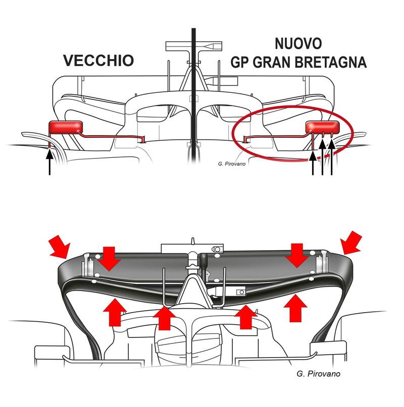 Piccoli aggiornamenti in casa Ferrari per il Gran Premio di Gran Bretagna 2022 di Formula 1. A Silverstone la Rossa ha portato un upgrade degli specchietti retrovisori. L’attacco alle pance adotta il supporto verticale non più collocato all’esterno dello specchietto, ma spostato nella parte interna. Sotto lo specchietto sono state aggiunte due piccole pinne verticali. Si tratta di una soluzione studiata in galleria del vento per ottimizzare i flussi d’aria che investono lo specchietto verso le pance. In Inghilterra si è anche vista un'ala posteriore in versione più scarica rispetto alla variante standard. Una soluzione, questa, già utilizzata in Canada, ma dal solo Leclerc, con vantaggi aerodinamici sul dritto, ottenendo velocità di punta più elevate rispetto alla versione standard usata sempre in Canada da Sainz. Questa versione dovrebbe adattarsi molto bene anche a Silverstone per avere velocità di punta più elevate.