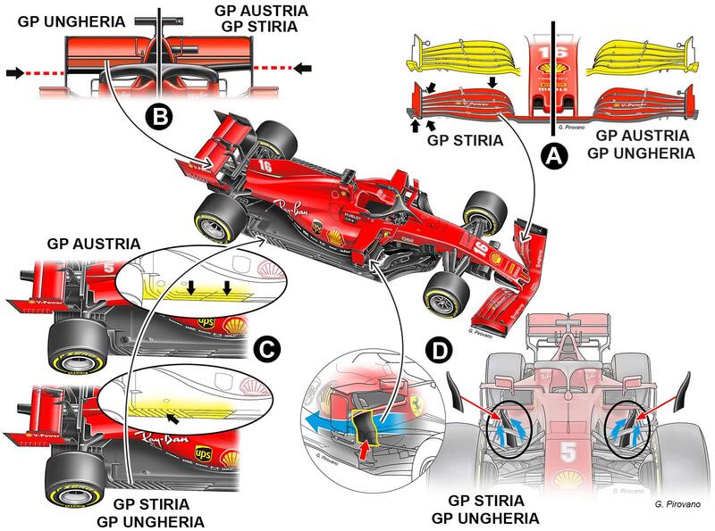 In Stiria sono stati apportati anche degli aggiornamenti ai deviatori sotto le bocche dei radiatori (D). In Stiria è stata introdotta una pinna verticale (una per lato) subito sotto la presa aria delle bocche dei radiatori. Soluzione per indirizzare e incanalare meglio l'aria lungo l'esterno delle pance. Soluzione, questa, poi usata anche in Ungheria. Il pacchetto di upgrade sviluppato dalla Rossa non ha portato ai risultati sperati, e bisognerà attendere l'inizio del weekend di gara per scoprire se possano arrivare ulteriori aggiornamenti. Quello che è certo è che per vedere interventi più drastici - leggi: muso stretto e pance - bisognerà aspettare, probabilmente fino alla fine di agosto. Solo allora sapremo se la Rossa possa porre rimedio ai difetti del brutto anatroccolo SF1000: scarsa velocità, troppa resistenza e difficile inserimento in curva.