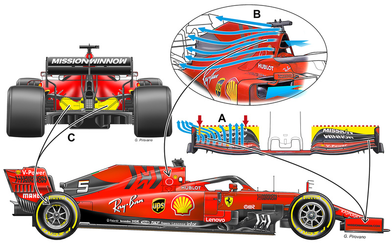Un dato emerso dalle prime tre corse dell'anno è la grande rapidità della Ferrari SF90 sul dritto: i tecnici della Rossa hanno optato per una configurazione a basso carico aerodinamico per ottenere velocità di punta elevate. L'ala anteriore (A) della monoposto della Ferrari sposa una filosofia tecnica completamente opposta rispetto a quella di Mercedes e Red Bull: sulla SF90, i flap nella zona esterna si attaccano alle paratie più in basso.