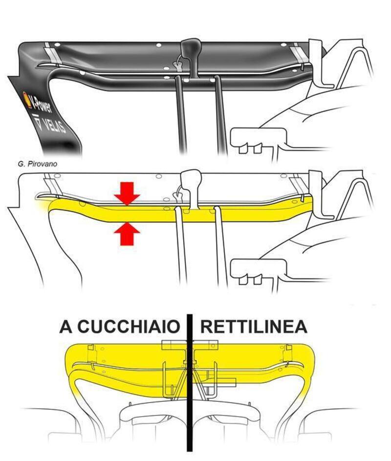 Le caratteristiche del tracciato hanno riportato la rossa al vertice delle prime prove libere, segno che la Ferrari con un carico maggiore funziona meglio. Piccola novità di micro aerodinamica sulla rossa per gli specchietti retrovisori. Sono state eliminate le due piccole pinne verticali posizionate sotto e ai lati degli specchietti, adesso presenta il solo piloncino verticale che li ancorano alle pance (vedi B).