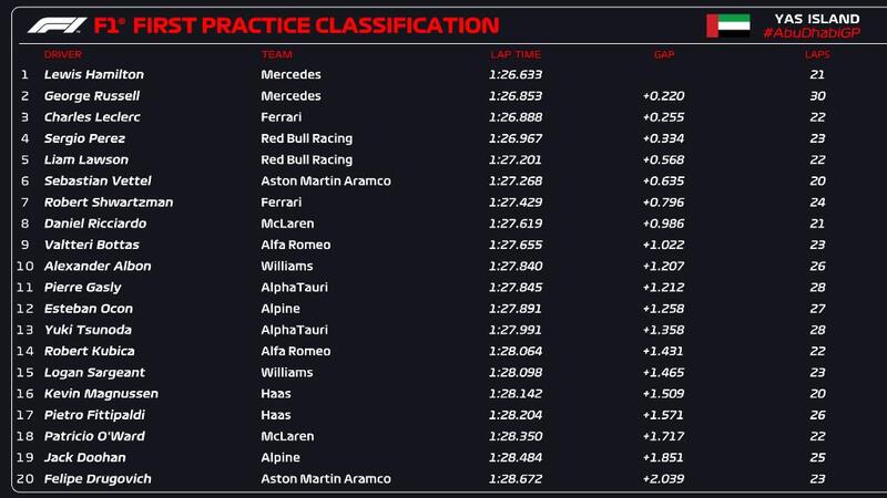 Fra i due rookie Sebastian Vettel sesto, mentre completano le prime dieci posizioni Daniel Ricciardo, Valtteri Bottas e Alexander Albon. Fuori dalla top ten Pierre Gasly undicesimo, seguito da Esteban Ocon, Yuki Tsunoda, Robert Kubica, Logan Sargeant e Kevin Magnussen. In fondo alla classifica Pietro Fittipaldi, Patricio O'Ward, Jack Doohan e Felipe Drugovich.
