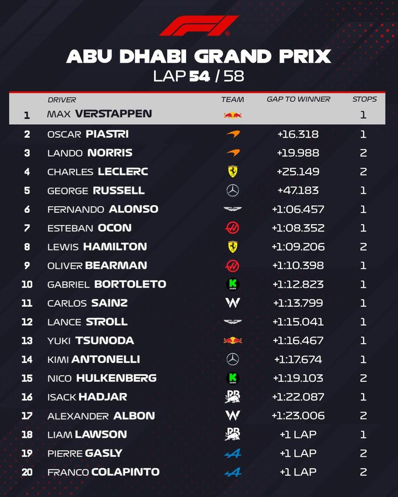 Sesto Fernando Alonso, seguito da Esteban Ocon, Lewis Hamilton, Nico Hülkenberg e Lance Stroll a chiudere la zona punti di Abu Dhabi. Undicesimo Gabriel Bortoleto, poi Oliver Bearman, Carlos Sainz e Yuki Tsunoda, penalizzato di 5 secondi per essersi difeso in modo irregolare su Norris, costringendolo a uscire dai limiti della pista. Si chiude così la parentesi di Tsunoda in Formula 1 come pilota titolare.