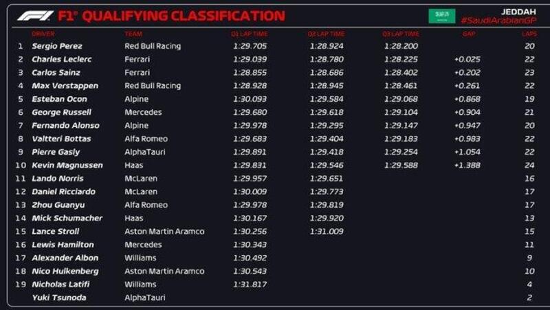Grande prestazione anche per Ocon quinto precedendo Russell unica Mercedes ad arrivare in Q3, ed il compagno di squadra Fernando Alonso e Valtteri Bottas. Completano la top ten Pierre Gasly e Kevin Magnussen che riporta il sorriso in casa Haas dopo il brutto incidente di Schumacher. Passi in avanti rispetto al Bahrain, ma non accedendo alla Q3 per la McLaren, con Norris davanti a Ricciardo, seguiti da Guanyu Zhou, Schumacher e Lance Stroll. Soltanto sedicesimo Hamilton che partirà dieci posizioni più indietro di Russell. Chiudono la classifica delle qualifiche di Jeddah Alexander Albon, Nico Hulkenberg, Nicholas Latifi, Yuki Tsunoda che è dovuto rientrare ai box in Q1 per un problema tecnico.