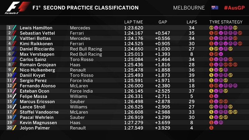 La Mercedes ha suonato la carica sin dal principio, ottenendo tempi competitivi con pneumatici supersoft, prima di passare - unico team a farlo nelle FP1 - alle ultrasoft. La scuderia di Brackley si è evidentemente nascosta nei test a Barcellona. La Ferrari, mattatrice delle prove pre-stagione, accusa un ritardo di oltre mezzo secondo dalla Mercedes a parità di gomme. Ad avvicinarsi maggiormente all'arrembante Hamilton nelle FP2 è stato Sebastian Vettel, staccato di 547 millesimi da Hamilton.