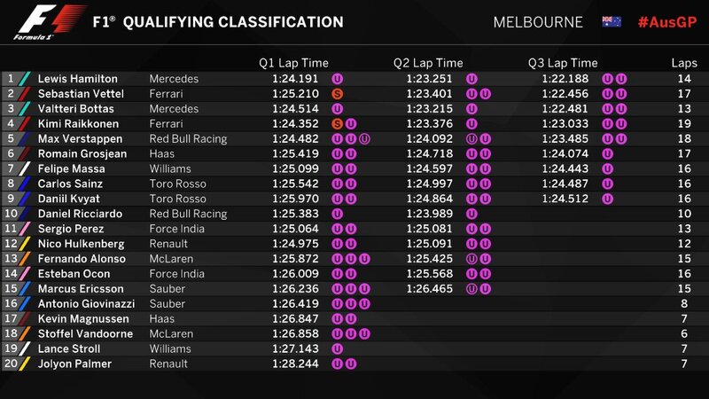 Nelle qualifiche all'Albert Park Circuit di Melbourne ad imporsi è stato Lewis Hamilton: sarà il pilota inglese a scattare dalla pole position nel Gran Premio d'Australia, prima prova del mondiale 2017 di Formula 1. 1'22"188 è il crono colto dall'alfiere della Mercedes, giunto al sessantaduesimo acuto al sabato in carriera e al sesto a Melbourne, lo stesso numero di pole di Senna in Australia. Quella conquistata da Hamilton è la prima partenza al palo nell'era delle nuove monoposto di F1, dall'inedita configurazione aerodinamica imposta dal nuovo regolamento tecnico: vetture più larghe, con ali anteriori e posteriori più generose in larghezza, diffusori inediti e diverse nuove soluzioni, come il ritorno del cofano motore a pinna di squalo.