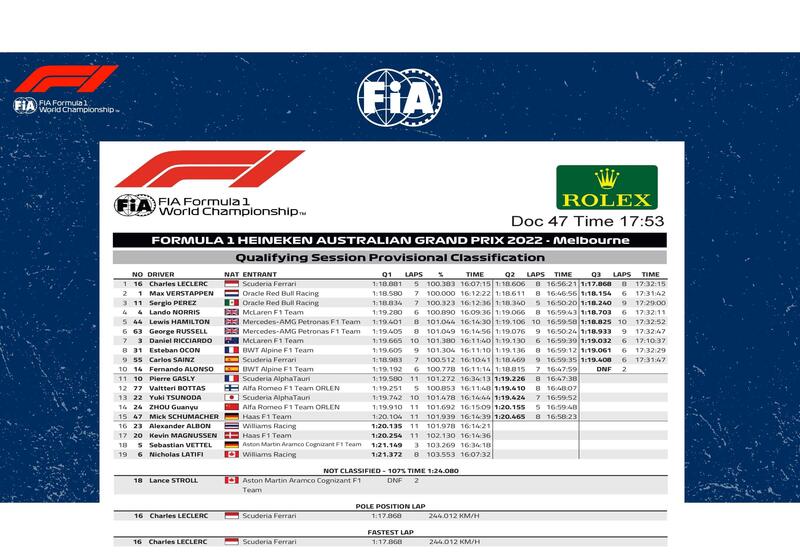 Undicesimo Pierre Gasly che è stato eliminato in Q2 insieme a Valtteri Bottas che ha visto interrompere la sua serie in Q3, il compagno di squadra Yuki Tsunoda, Guanyu Zhou e Mick Schumacher unica Haas in Q2. Chiudono la classifica delle qualifiche di Melbourne Alexander Albon, Kevin Magnussen, Sebastian Vettel che non è riuscito con soli due minuti a disposizioni a superare il taglio in Q1, Nicholas Latifi e Lance Stroll.