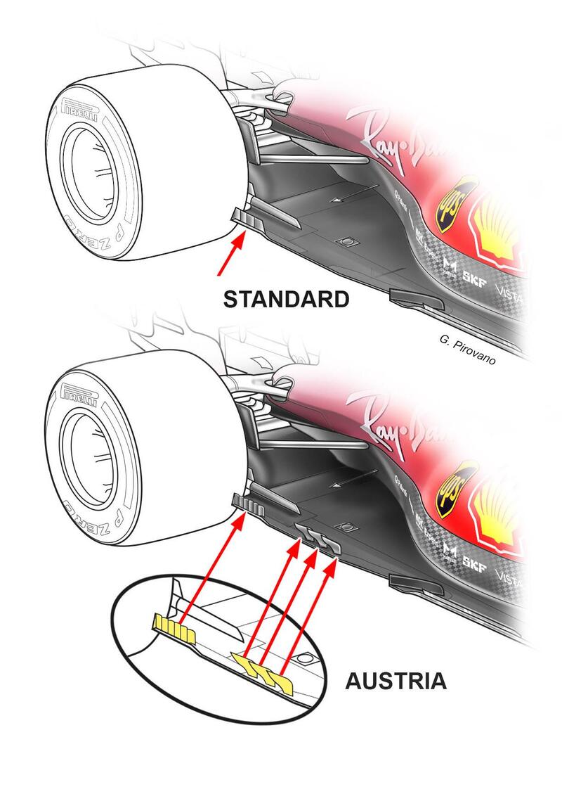 La serie di piccoli deviatori rettangolari posti subito davanti le ruote posteriori consta di sei elementi invece dei quattro della versione standard. Si tratta di una soluzione in ottica futura, pensata per la gara di Silverstone, in cui la Rossa, viste le caratteristiche del circuito, potrebbe faticare. Il nuovo fondo piatto, quindi, dovrebbe essere solo testato nelle libere, ma non in qualifica e in gara in Austria.