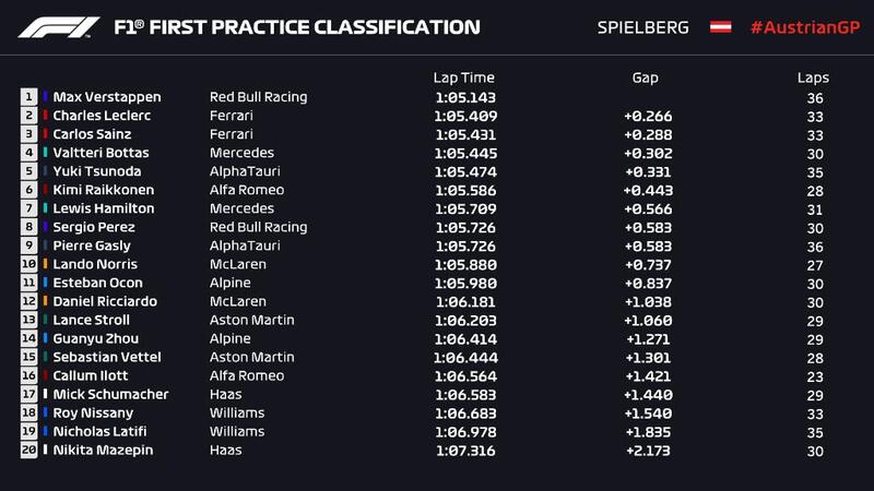 Dietro alle due Rosse Valtteri Bottas (+0.301), mentre Lewis Hamilton che si è dedicato principalmente alle gomme che la Pirelli farà esordire a Silverstone e a provare un'ala più scarica, è 7° (+0.556). Fra le due Frecce Nere si sono inseriti Yuki Tsunoda (+0.331) e Kimi Raikkonen (+0.443), mentre Sergio Perez, Pierre Gasly e Lando Norris completano la top ten.